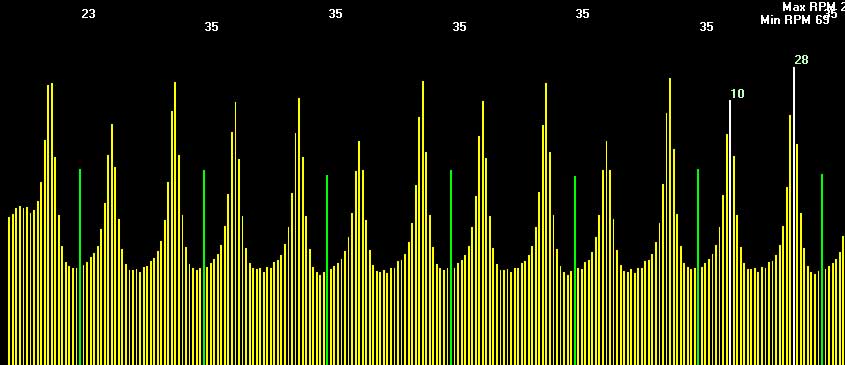 Je prends le temps de regarder le graph, les barres verticales jaunes représentent les dents de la roue, chaque pics est en fait le point mort haut d'un des cylindres et les barres vertes la position de la dent manquante. Entre deux barres vertes il y a un tour de vilo donc 2 compressions. Les chiffres 35 sont le nombre de dents présentes sur la roue. A droite le 10 représente le nombre de dent estimé entre le PMH et le capteur soit 100° (10 dents à 10° chacunes), c'est la valeur à regler dans le soft pour que le moteur démarre puis il faut l'affiner avec une lampe stromboscopique. Le 28 (280°) est l'autre position possible du capteur et forcément il y a 18 dents donc 180° entre les 2 positions possibles, moi je sais que c'est 100° la bonne valeur car j'ai soudé la roue au moyeu à environ 90°.