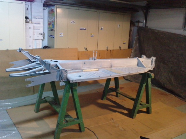 Le châssis est mis a nu, les dômes des sièges supprimés, le tout sablé et poncé comme il faut.