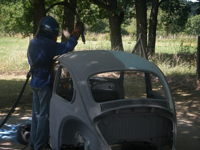 Après le démontage vient le temps du sablage, la caisse est d'abord décapée à la main.