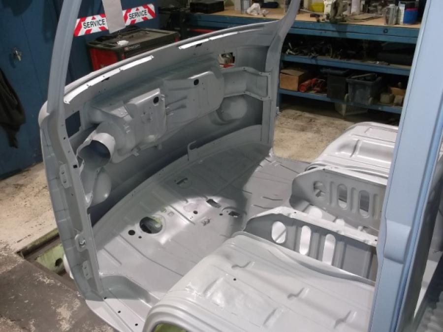 apres un bon decapage a blanc de tout l arriere de l interieur ,avec une bonne partie de plaisir au diluant pour la colle de la toile de pavillon, un coup de phosphatant et mission arrosage de l appret finie. pour le compartiment avant je verrais plus tard, reste des points de rouille et des petites defauts a corriger a la soudure. au mois l arriere est proteger et ne rouillera plus.