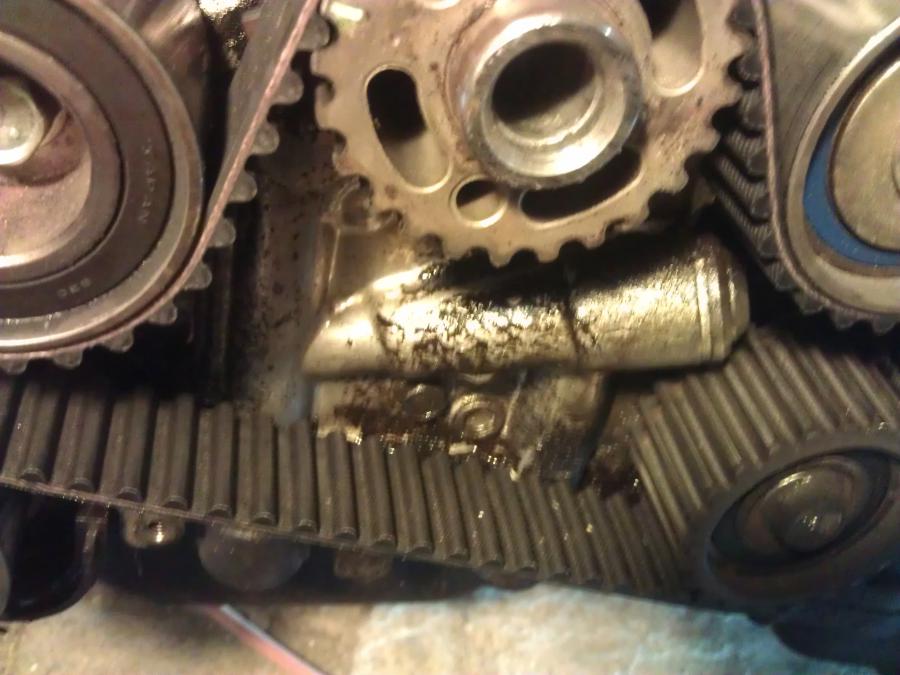 alors je démonte: effectivement y'avait une belle fuite !! y manquait un bout du spi....donc je change tout ca, je remonte et au moment de serrer le tendeur de courroie de distri, ben , pas de serrage et le filetage vient avec le boulon !!!