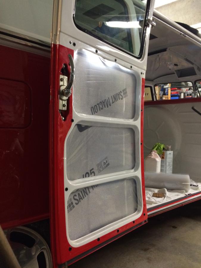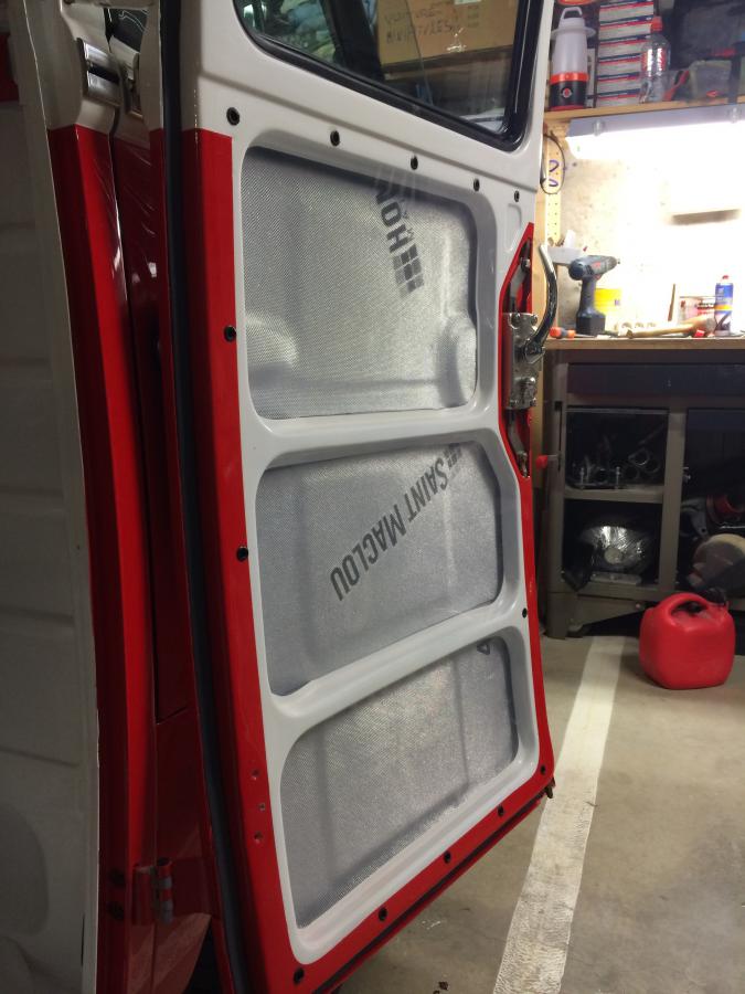 Dans l'ordre, j'ai mis des plaques de goudron autocollantes, un isolant (thermique et sonore) initialement prévus pour les sols parquets, et enfin un film plastique épais pour protéger le medium des panneaux de portes de l'humidité qui pourrait circuler dans la porte (ventilation naturel pour éviter les accumulations...)