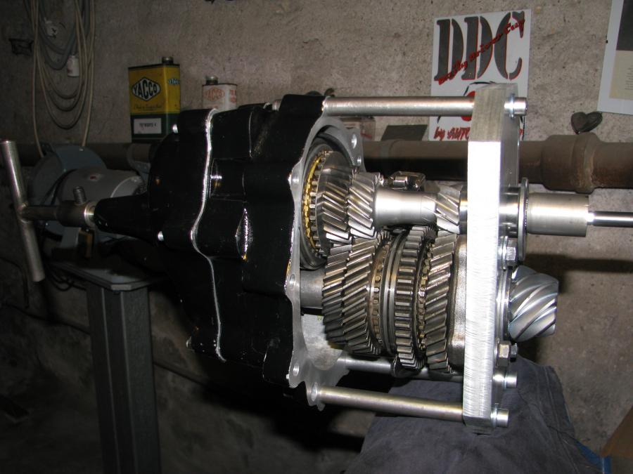 Les deux arbres sur le gabarit pour le montage du carter intermédiaire (je ne détaille pas le montage des fourchettes de commande c'est comme pour un carter d'origine): Un petit coup de presse: La bague du pignon de 5ème à la presse aussi: Pignons de 5ème en place: Et enfin le moyeu et baladeur: Il ne reste plus que le réglage des fourchettes: Petite vérification avec le nez de boite pour valider les réglages