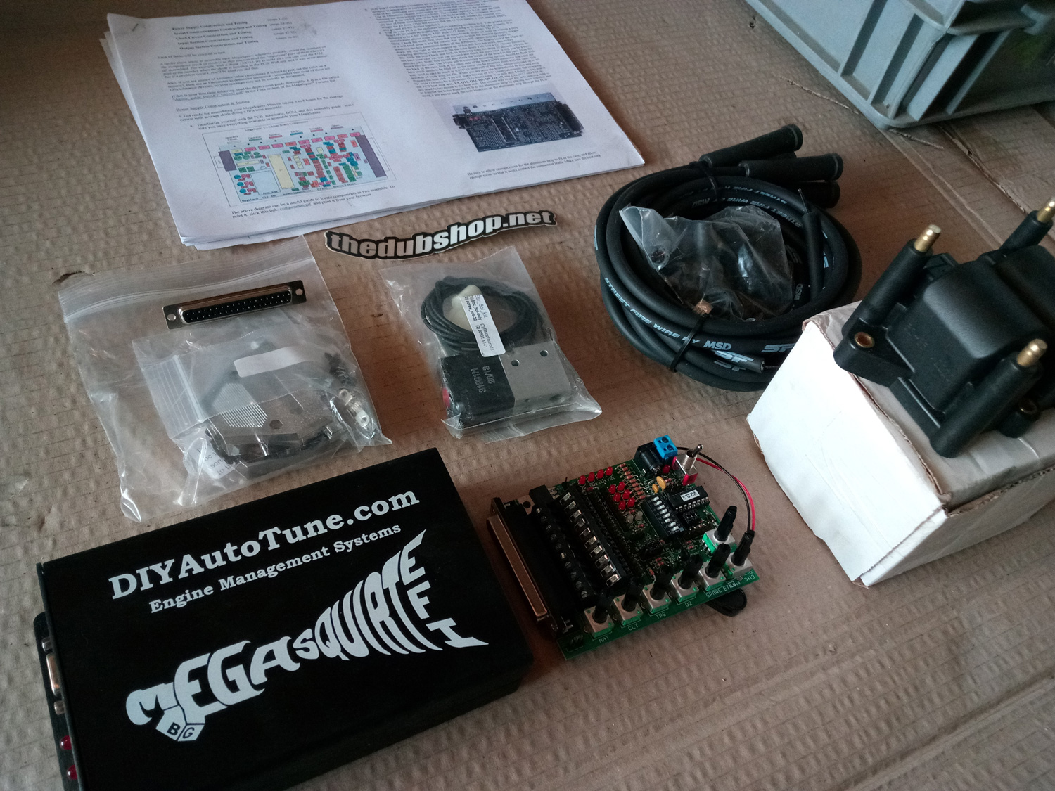 - 1 Megasquirt version 3.0 montée et testée + Megastim (la carte permettant de tester la MS), avec modules pour gérer l'allumage à étincelle perdue, module pour gérer un solénoide de turbo, et module de connection USB.
