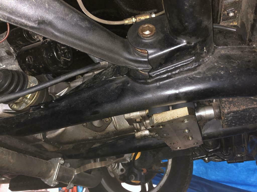 La boite est ceinturée, la config me laisse penser qu'elle est fort en arrière aussi. A l'avant une traverse "maison" sur silentbloc.