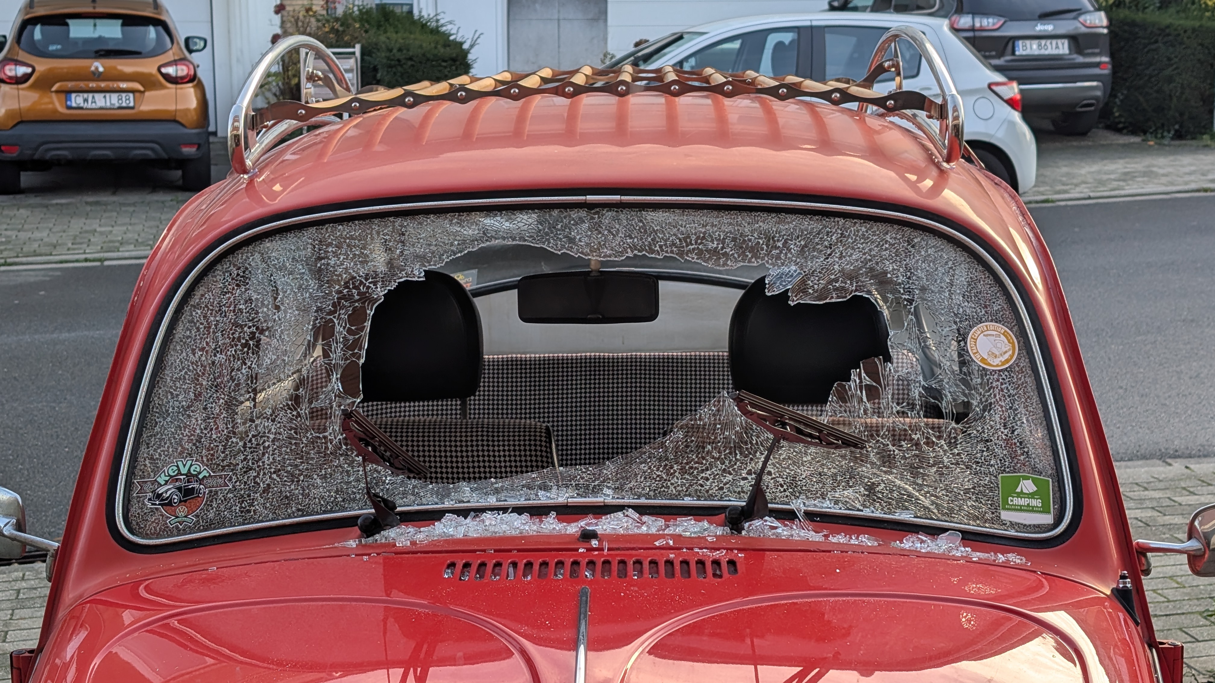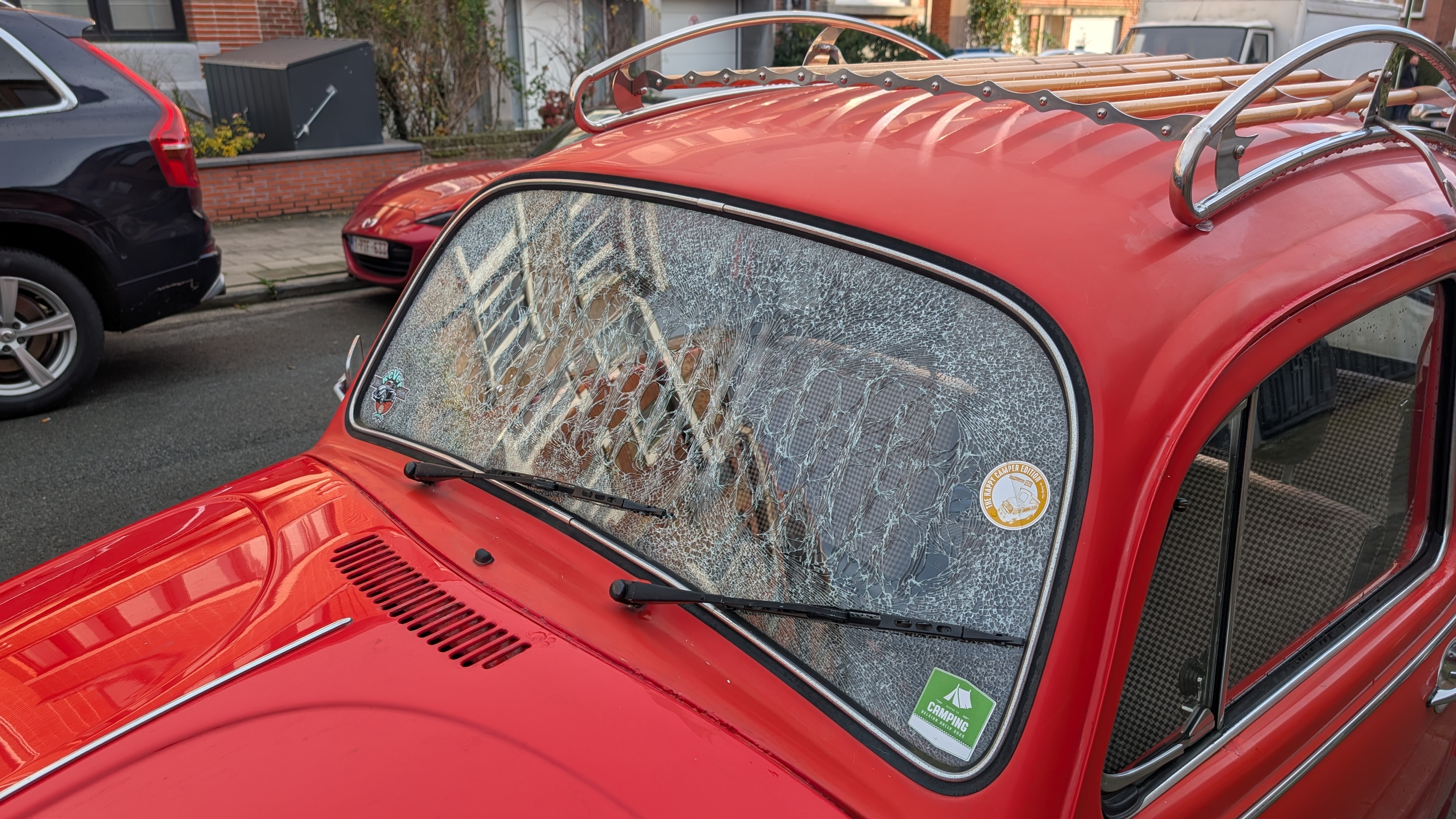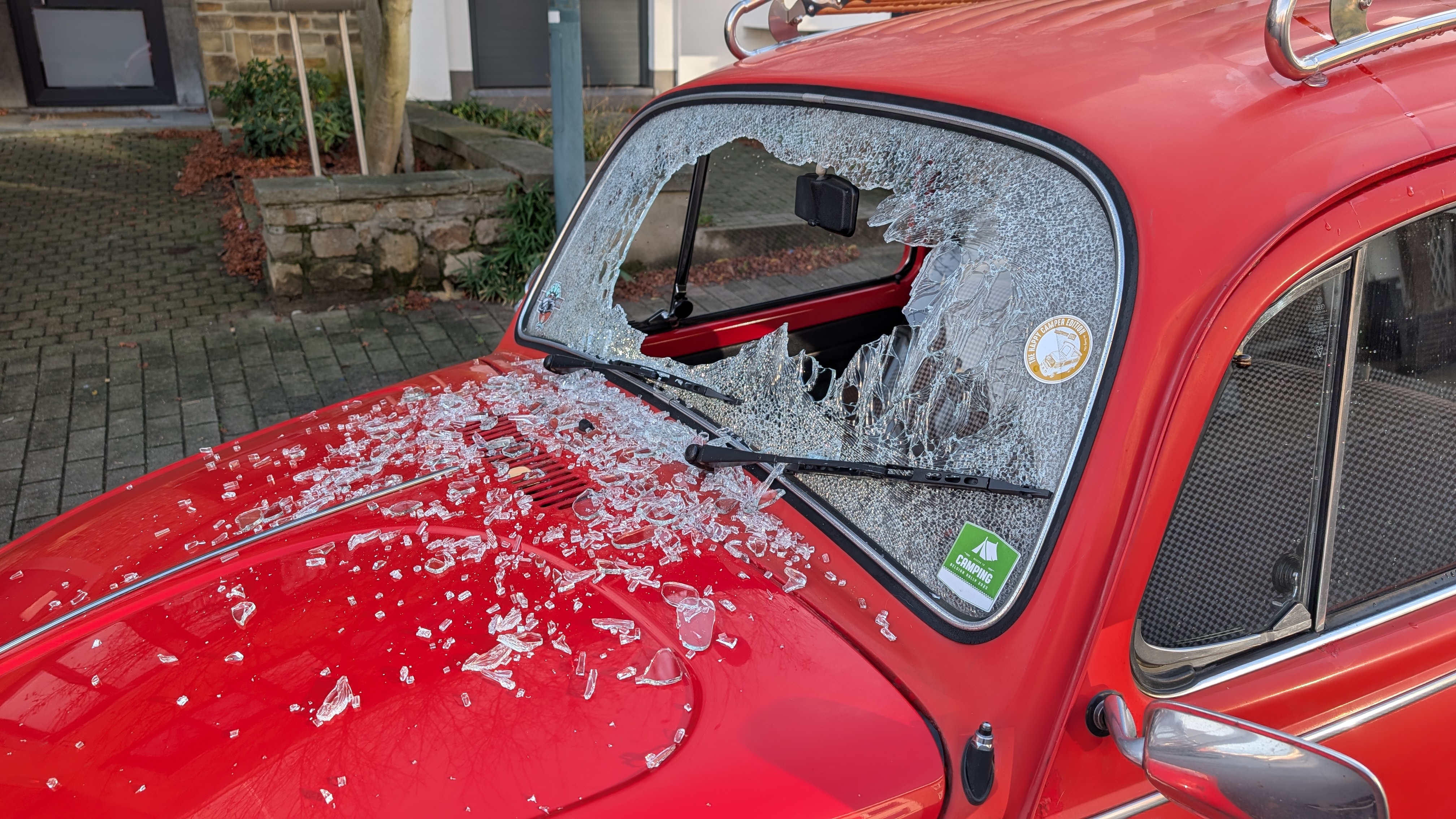 Quant au parebrise cassé ... à par un acte de vandalisme, je n'en vois pas trop la raison, il n'a pas gelé, la voiture n'a pas eu d'impact de caillou. Elle n'a pas roulé de samedi soir à hier matin ...