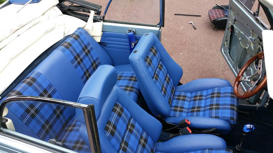 Mes vieux Recaro en skaï sont tout refaits en cuir et tissu écossais, hommage aux sièges de Golf GTi One, l'AR et les panneaux de porte aussi.