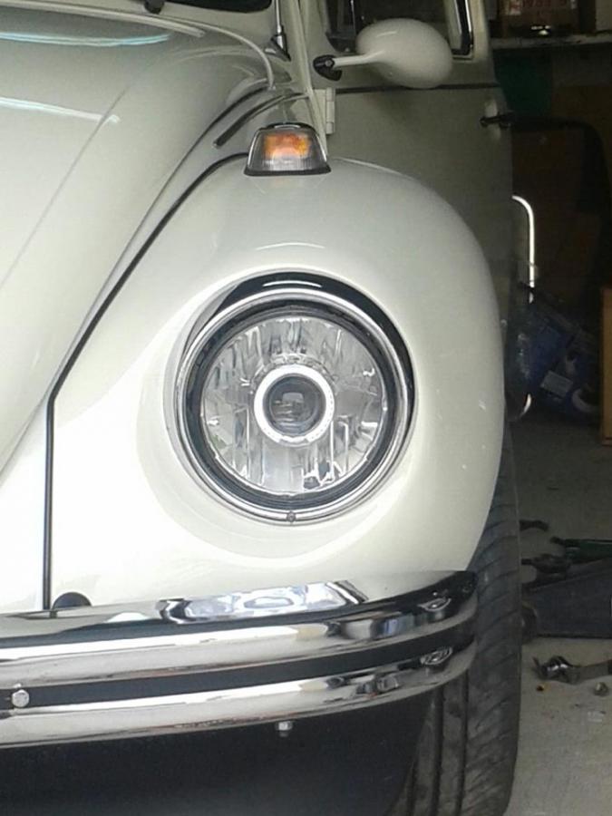 Pour ce qui est de l'espace dans le passage de roue c'est la photo qui fait ca car le bol se situe entre la joue d'aile et la roue, et meme lors du braquage je n'ai eu aucun soucis. Mais je peut mesurer car suivant l'ET des jantes utilises ce sera peut etre pluschaud surtout au braquage. Apres moi j'ai utilise ce systeme (assez encombrant) car je voulais pouvoir acceder a l'ampoule sans tout demonter mais il est possible de faire quelque chose de beaucoup moins encombrant car l'ampoule ne depasse du bol que de 4cm.
