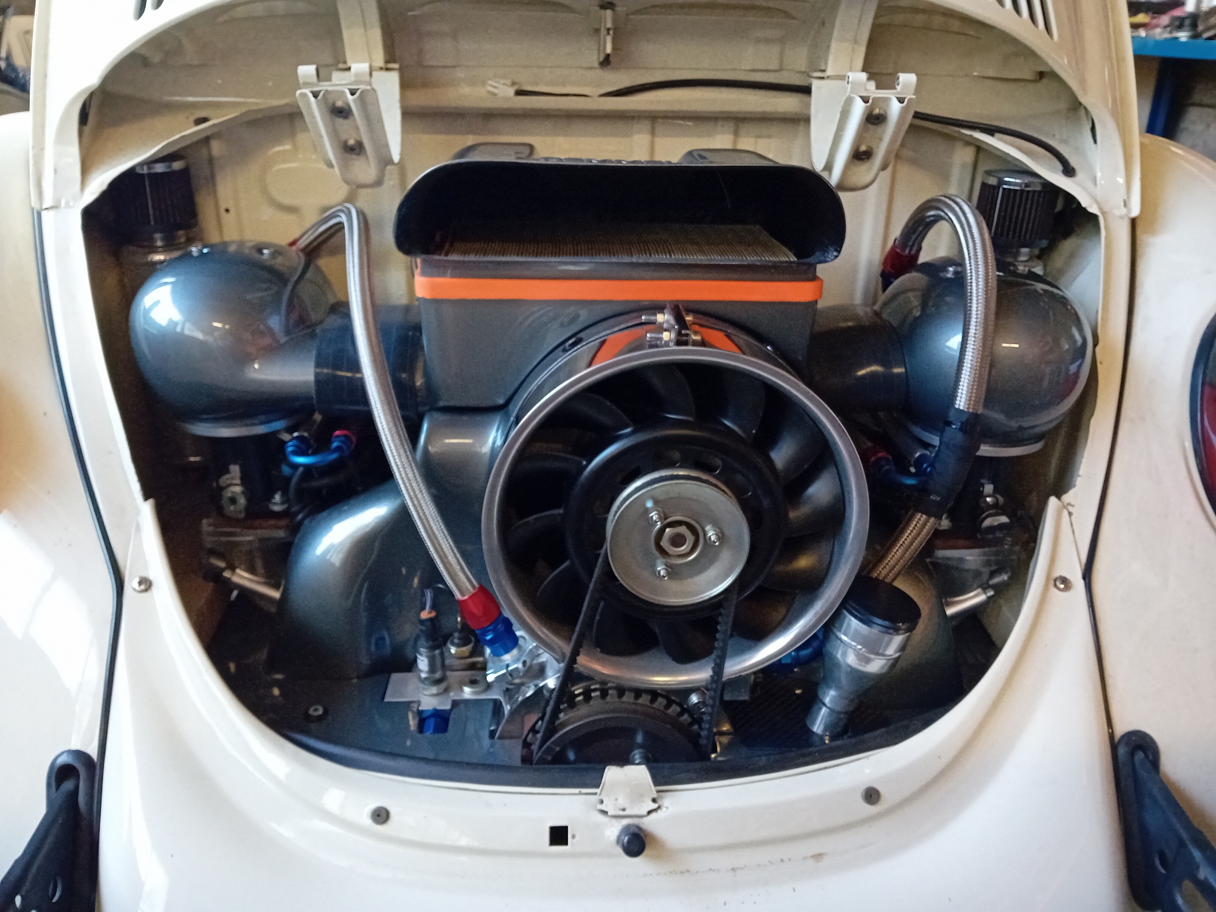 La 1303 roule à nouveau et ça fait un bien fou! Pour rappel suite à la casse du vilo sur le 2.8 et remplacement de celui-ci j'ai aussi fait pas mal d'autres modifications comme les culasses Remmele CNC, collecteur CSP 48mm. Sur un moteur comme ça ou tout est fait sur mesure j'ai du modifier beaucoup d'autres pièces comme la coiffe, tube enveloppes CSP, tiges de culbuteurs TP, etc...