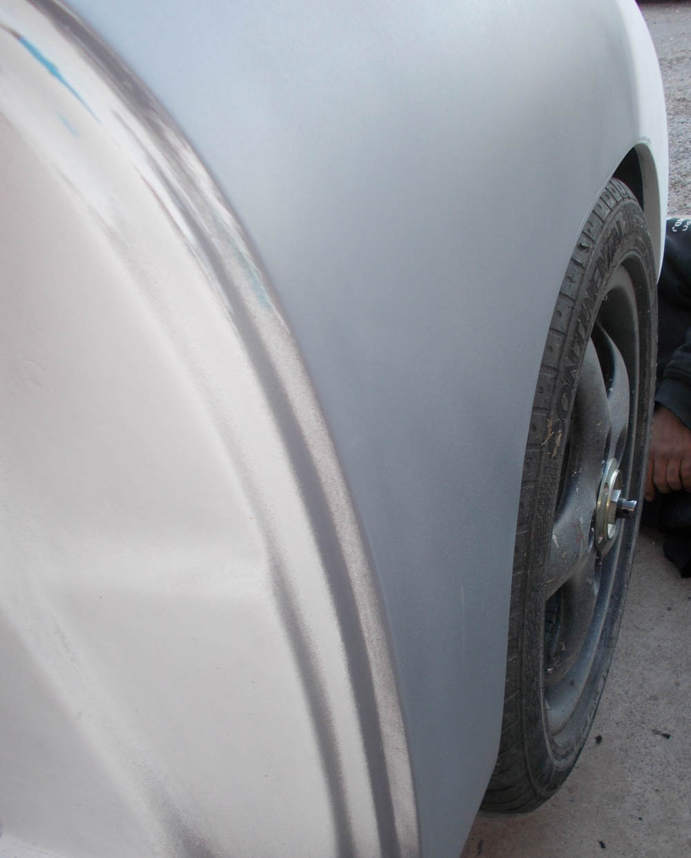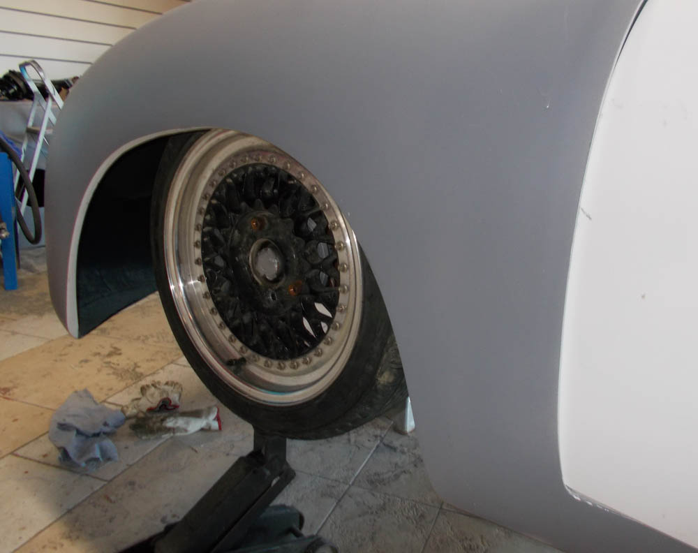 montage a blanc avec une jante en 16x7 (BBS a Alan), pour valider le braquage et le centrage de la roue dans l'arche…