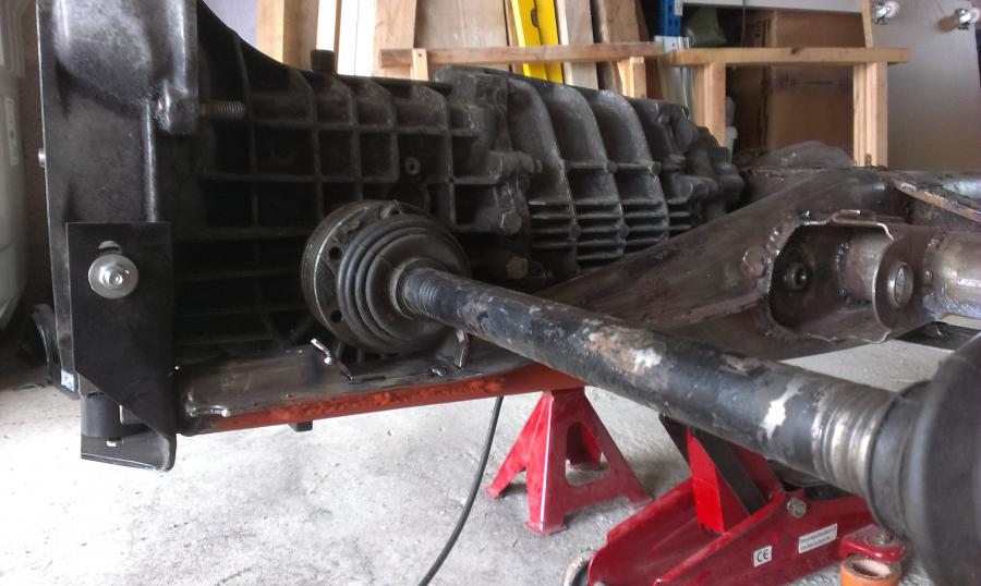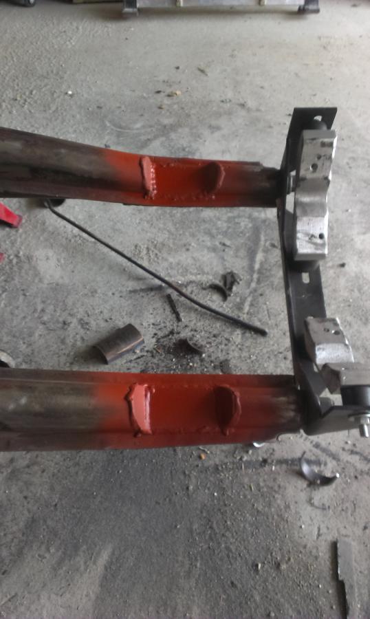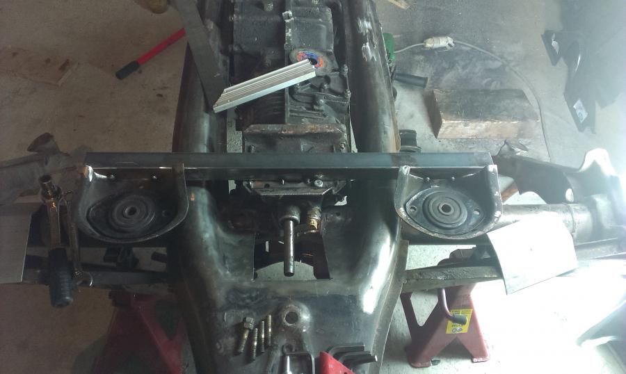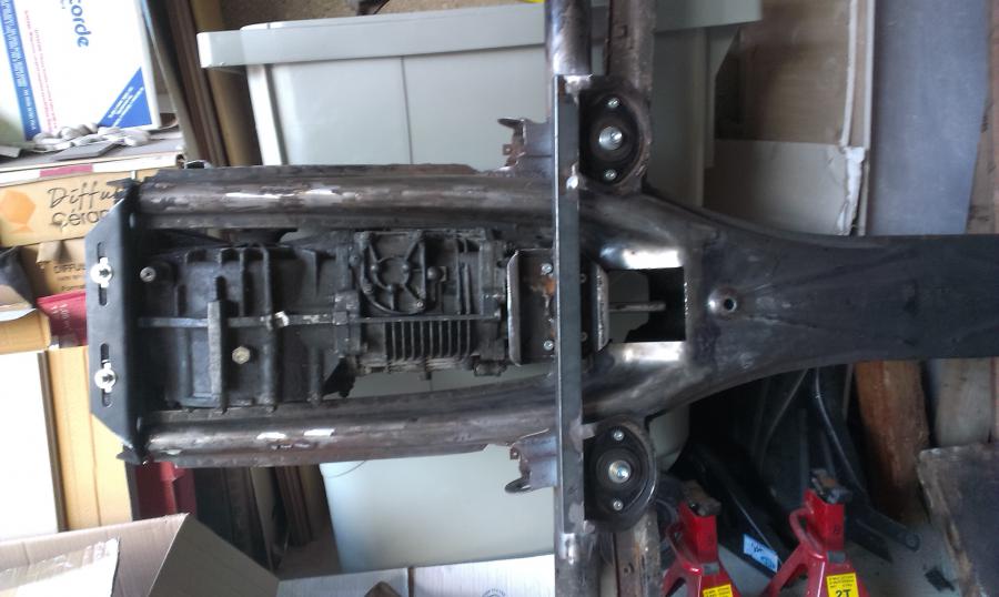 J'imagine une traverse basée sur des morceaux de traverse 915, qui reprennent les silentblocs d'origine. C'est peu orthodoxe, mais je n'ai pas une bonne cintreuse sous la main. Après validation de l'emplacement (un poil vers l'avant du châssis par rapport aux supports de bras obliques), je pointe et soude les supports qui reçoivent des écrous, afin de venir visser la traverse. C'est du 4 ou 5mm d'épais, bien rigide. L'ensemble n'est pas fermé, déjà pour accéder, mais surtout pour facilement traiter et éviter les dépots, et ainsi la rouille. ça ne me plaisait pas de percer les supports de bras... Vient ensuite la fixation à l'arrière, dans les supports alu Martin Bott. On bloque avec de bêtes serre-joints, et perçage!