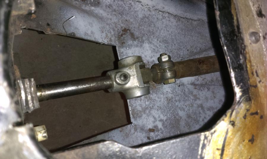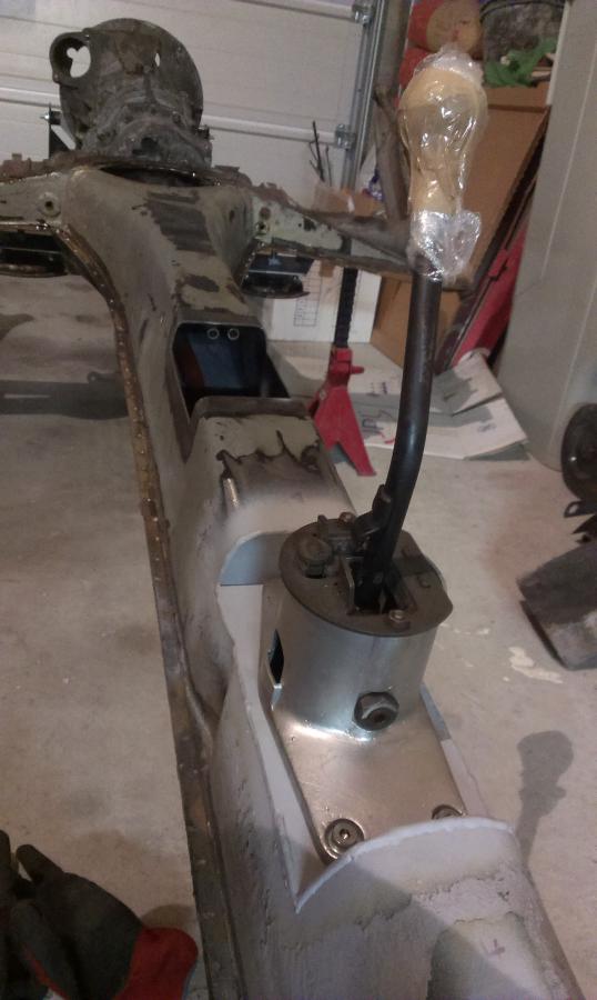 Doigts dans le nez avec mon outil spécifique... un truc de chirurgie avec un angle à 90° au poil. A l'heure actuelle, je n'ai pas fraisé à 45°, faut que je trouve une fraise... Je remonte le levier, même s'il n'est pas encore restauré, et j'attaque la tringlerie. Je mesure un manque de 125mm, donc je me fabrique un gabarit, et coupe coupe! Avec une rallonge en tube emmanchée et soudée, la nouvelle tringlerie prend place, avec boite et levier et coupleur Et je vire l'arche de positionnement... Les 5 vitesses passent impec, la marche arrière aussi