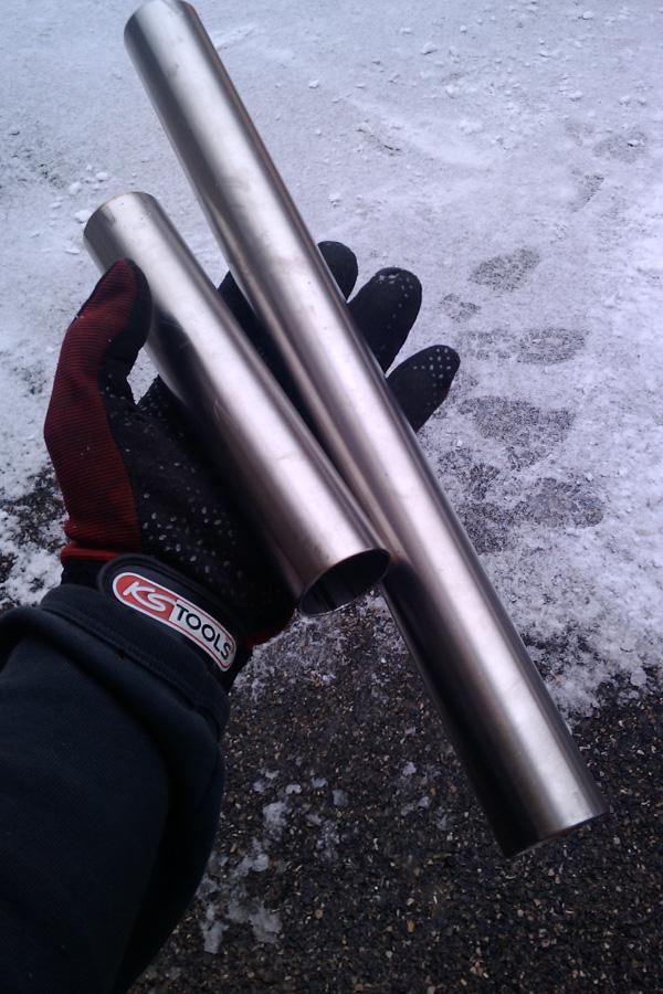 Je pensais avoir trouvé une demi-journée complète pour bosser... Perdu ! J'ai quand même eu le temps de couper 2 tubes inox : le premier va partir à la soudure, pour faire une dérivation pour le vase d'expansion. Le second est la première pièce du circuit de refroidissement! J'ai aussi récupéré le coude qui permettra de retourner et de déplacer le boitier papillon. Comme d'hab, les soudures sont au top! Voilà, c'est maigre comme news, mais après 3 mois sans y toucher, je suis à fond avec rien