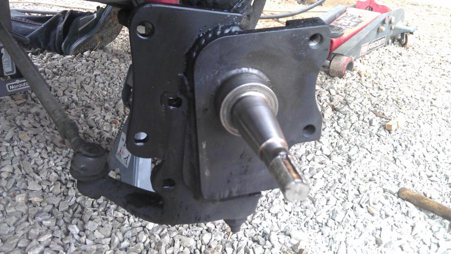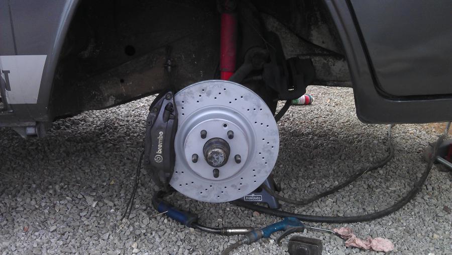 alors on commence par tout viré et mettre le disque en place avec etrier pour voir .. une fois que l'ami Lo a bien cogité, fait des gabarits en carton, ben découpe de la pièce et soudure en place, après avoir viré les moyeux pour pas que les roulement chauffent... Voila le support une fois fini et peinds....donc a droite la fixation pour l'etrier d'origine, et a gauche la fixation pour le Brembo.. et voila le travail avec disque et étrier monté un grand merci a LO pour son accueil et son taf