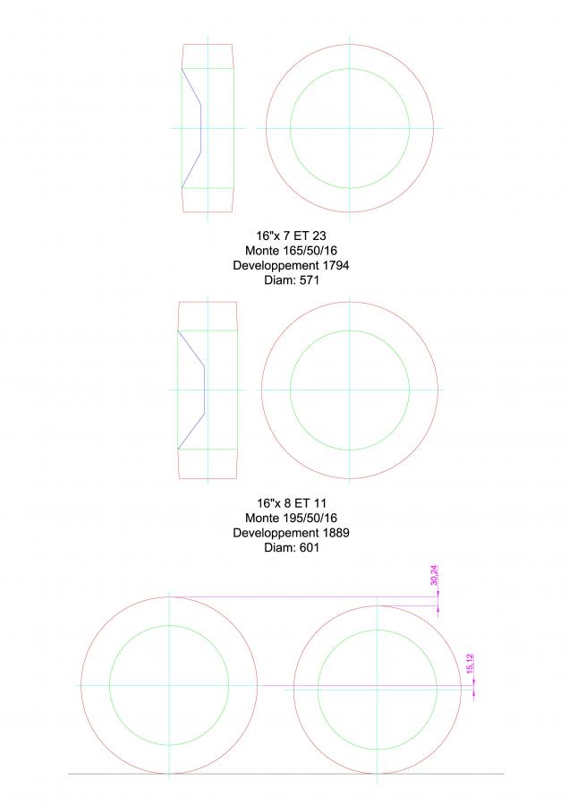 Et vu qu'à largeur donné l'angle et donc la déformation varie selon la hauteur de flanc, j'ai fais mes essais en partant d'un flanc standard cad du 195/50, du 215/45, du 235/40 en gros un flanc entre 6 et 7 cm de haut qui est selon mes essais d'il y a un paquet de temps, le meilleur compromis précision, confort fiabilité (comprendre casse de jante).