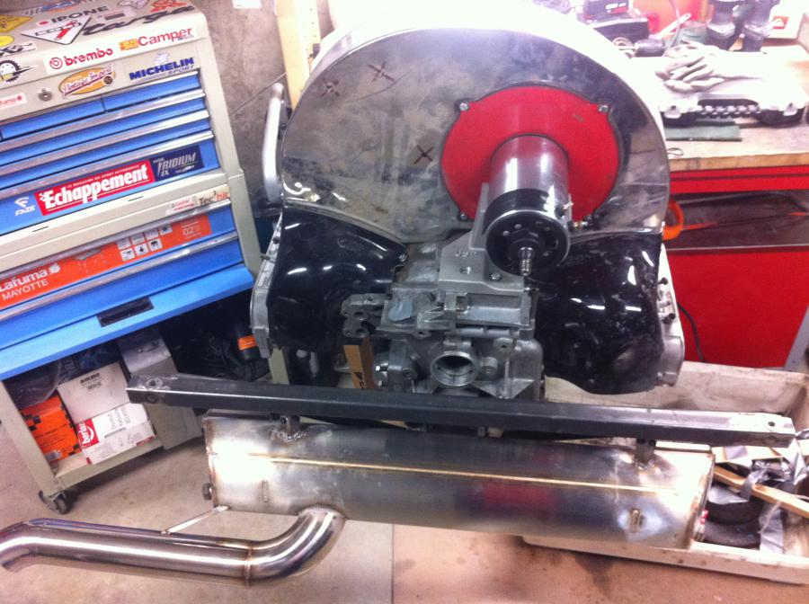 Petit montage à blanc des périphériques moteur et de l'échappement dans l'attente d'un nouveau collecteur.