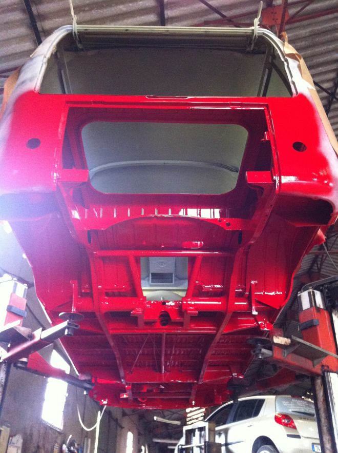 Ensuite, la tôlerie étant terminée, le combi est parti chez le peintre pour que je puisse démonter entièrement le bus, puis terminer les soudures sur le châssis et meuler les divers soudure, faire les joint et peindre le dessous et l’intérieur avant de la remettre sur roue pour aller en cabine peindre l'ext...(j'ai pris une semaine de vacances début avril pour faire ça)