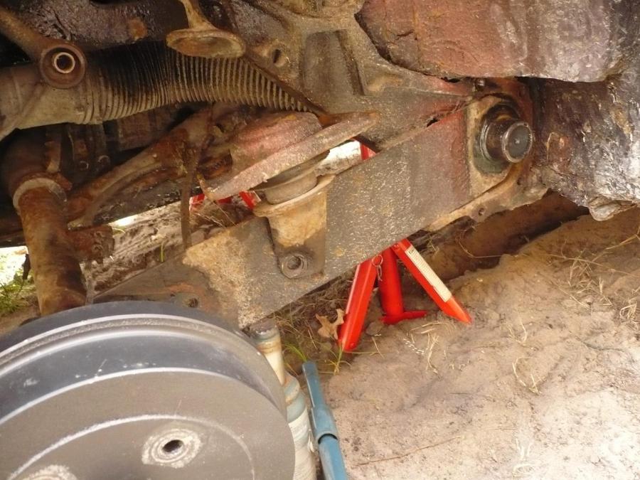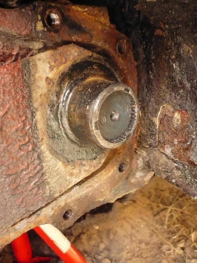 ! Déjà, voilà la galère, pour virer les 3 gros fucking boulons qui maintiennent l'arbre de roue à la lame... 26 ans sans être (à priori) démonté, ça n'aide pas, surtout que le dernier que j'ai attaqué (celui placé à l'avant) n'a pas coopéré du tout. Ensuite, j'ai viré les 4 boulons du cache barre de torsion, ça va, c'est propre mais va falloir commander les silentblocs