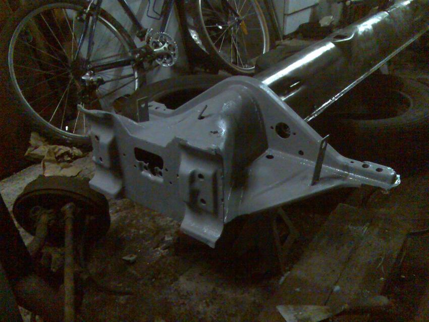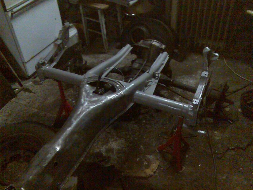 Bon résultat du weekend, mise en aprêt de certains éléments du chassis aprés mise à nue du chassis je pense que je vais juste vernir la poutre j'adore trop le métal à nue.