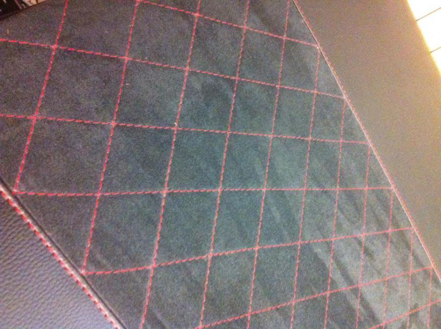 Puis avec Pat on a attaqué les cotés du ciel de toit, d'abord collés en haut pour bien les positionner. Puis collage de la totalité de la surface, découpe des fenêtres et pose des joints et charnières direct pour tout plaquer en place... Et pareil sur le petit côté... J'ai super hâte de voir les panneaux posés!! Toute la partie haute, ciel de toit compris est en alcantara perforé, les panneaux en skaï et alcantara non perforé, avec les surpiqures rouge je pense que ça va bien le faire!!!!