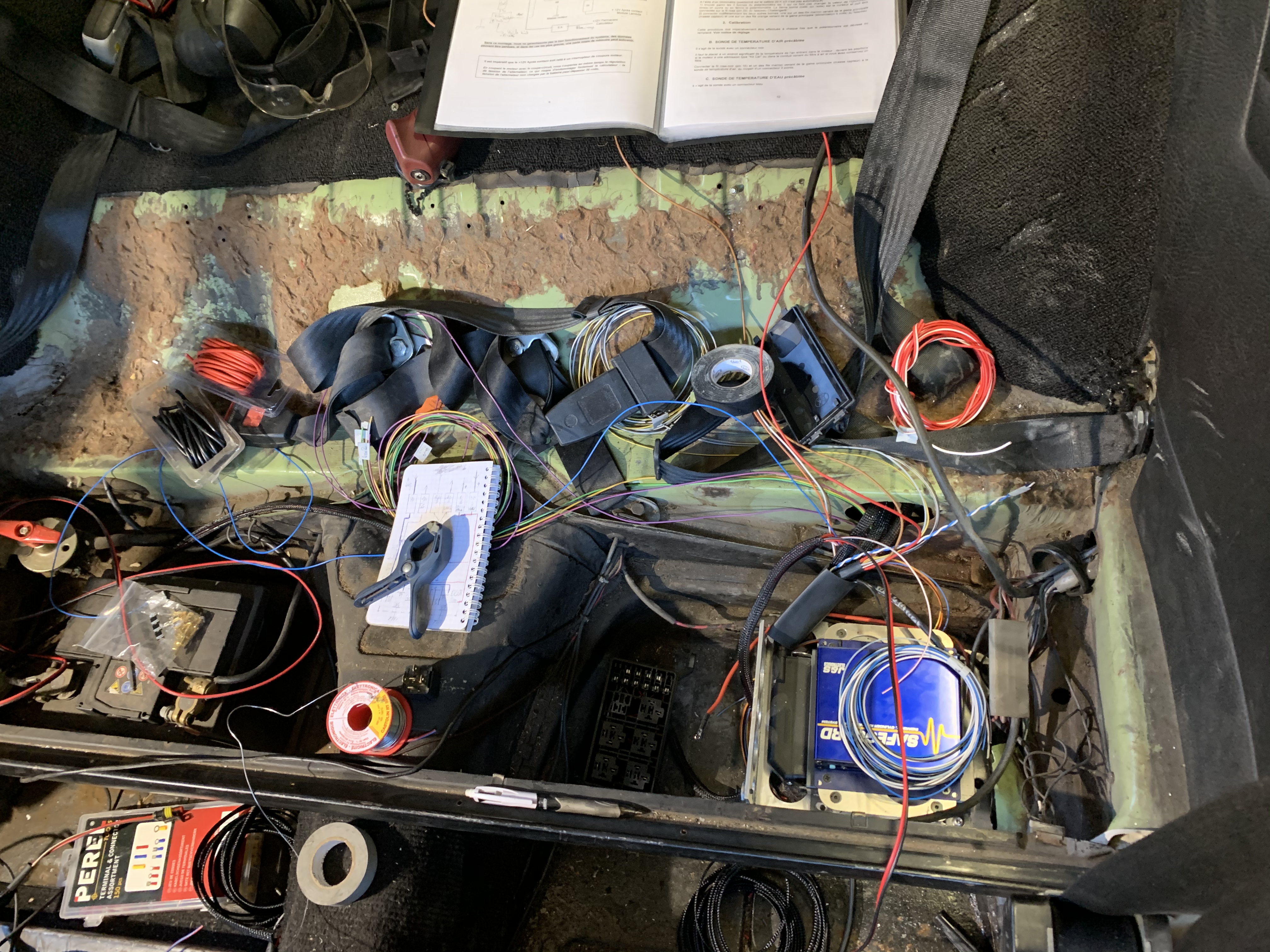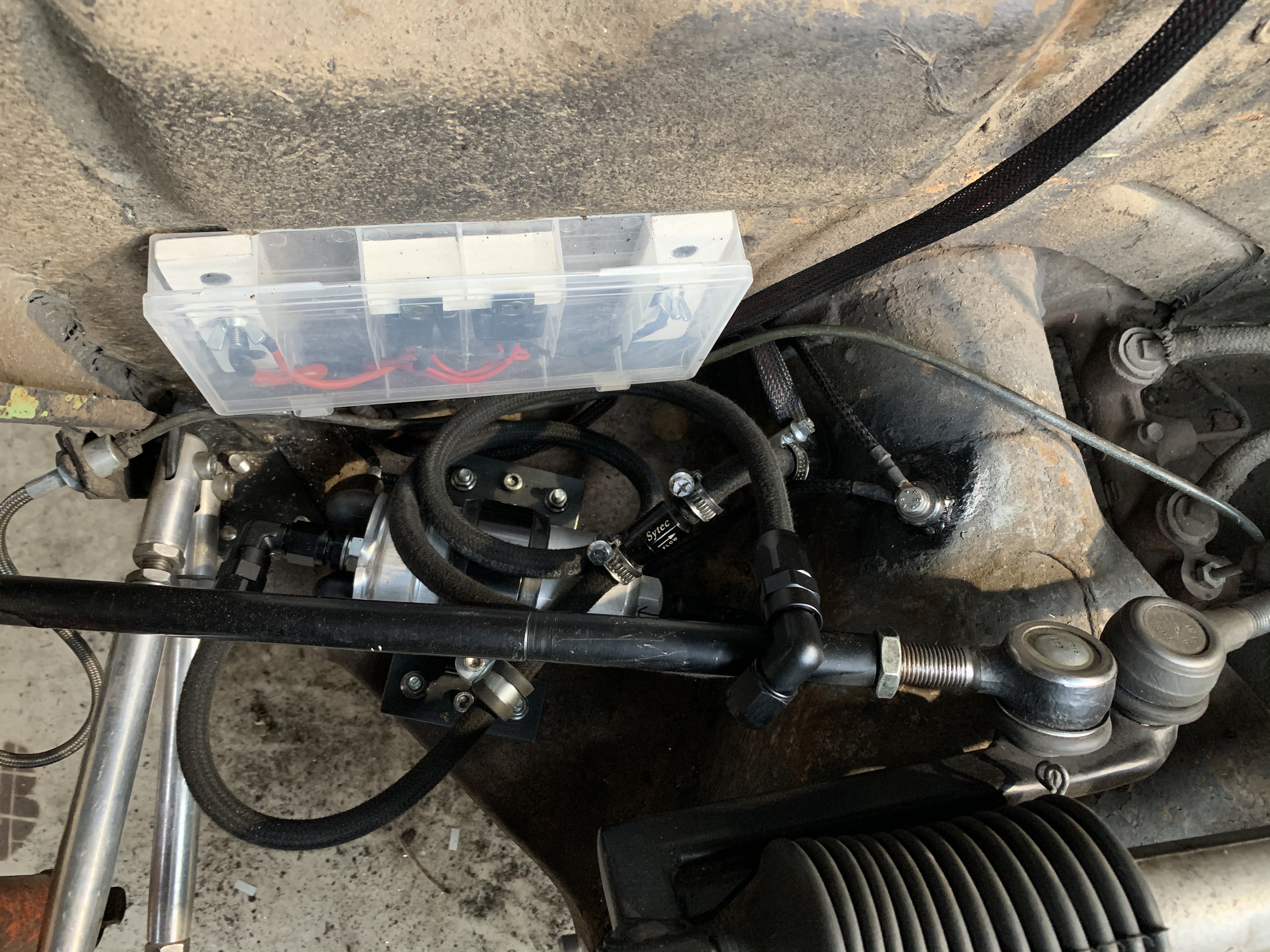 J’ai terminé le circuit d’essence, passé le retour dans la poutre avec un câble d’alim en 6mm2, et monté la pompe sur silentbloc, avec clapet anti retour. Et j’ai fait une espèce de boite avec les relais de pompe et afr.