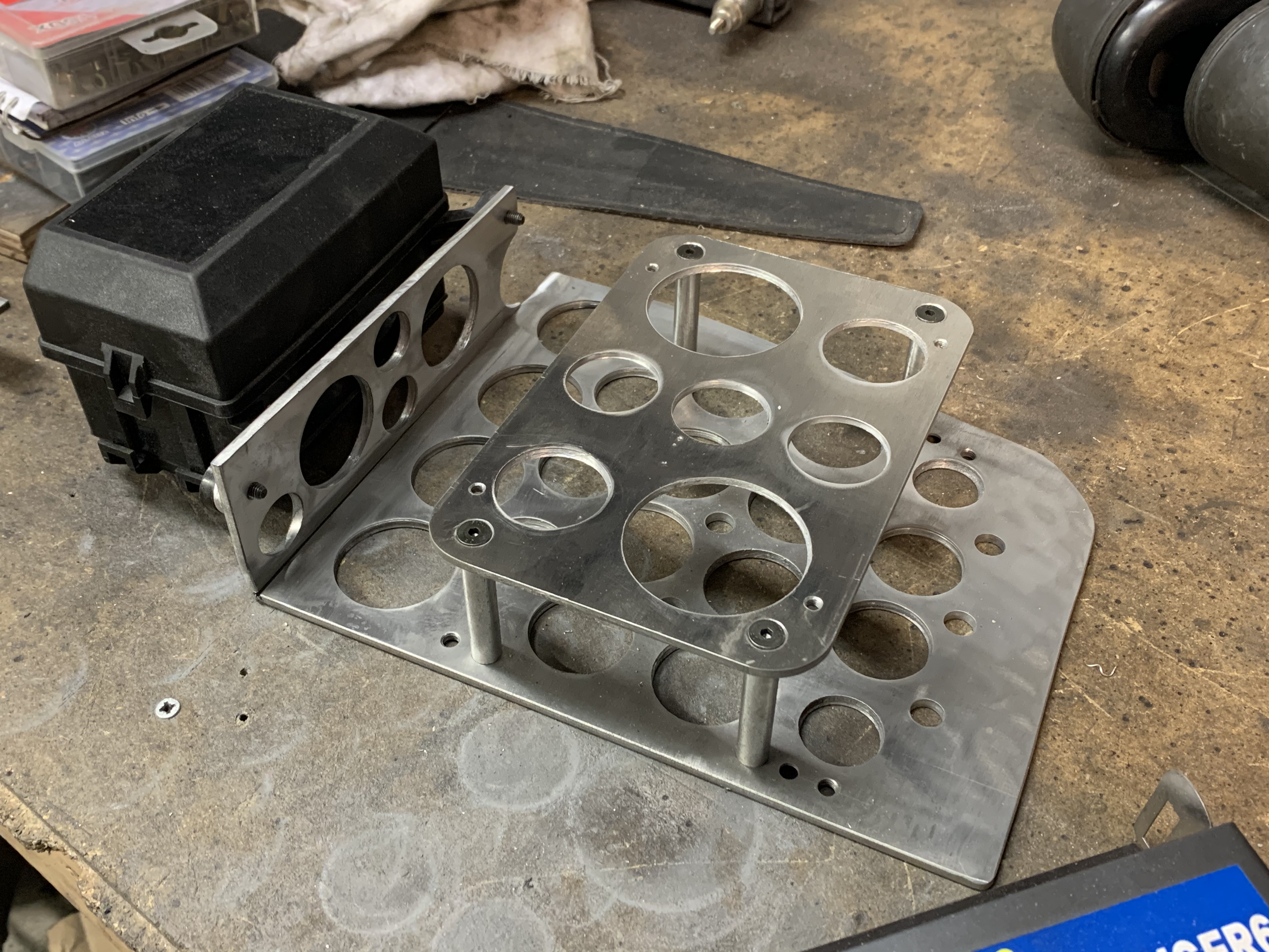 J’ai terminé le faisceau d’injection/allumage, et j’ai fait un p’tit support en alu pour les calculos et boite à fusibles, plein de trous ( j’aime bien les trous )