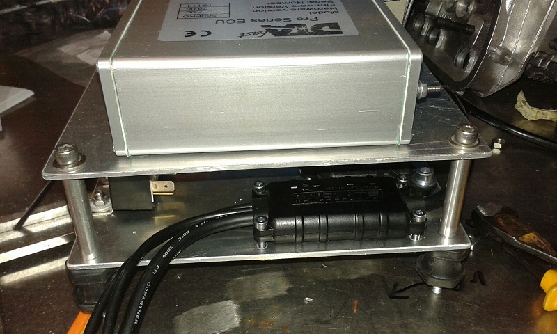 Pour que tous les éléments soient au même endroit j'ai créé une platine à 2 étages, le premier reçoit les relais, fusibles, capteur barométrique, l'Innovate LC2 (sonde lambda) et les jonctions communes. Le deuxième étage reçoit le calculateur DTA S60. Ce module se trouvera derrière la banquette côté conducteur pour relier tout ce petit monde au moteur j'ai choisi un connecteur Deutsch à 31 voies étanche de la gamme industrielle/PL/agricole car la gamme Motorsport est vraiment plus chère, surtout l'outil de sertissages des pins qui avoisine les 600€! La tôle au dessus de la boite de vitesse est percée pour fixer la partie de la prise fixe, il y aura que 2 prises pour enlever le moteur: le connecteur Deutsch et la prise de l'alternateur.