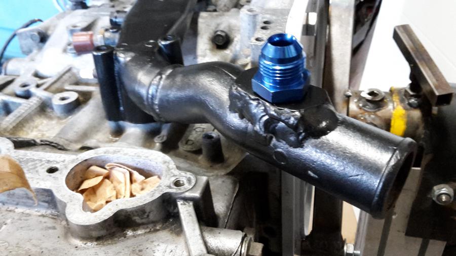 La pipe d'eau inversée est percée et taraudée. Un piquage est au même endroit qu'avant pour refroidir le papillon et l'actuateur, et j'ai prévu un emplacement pour une sonde de tempé (bouché par une vis actuellement).