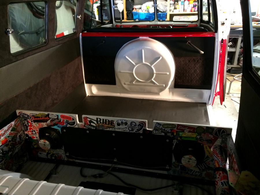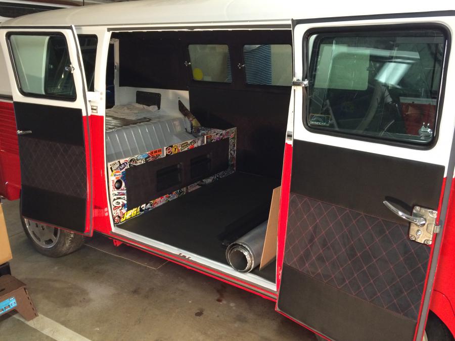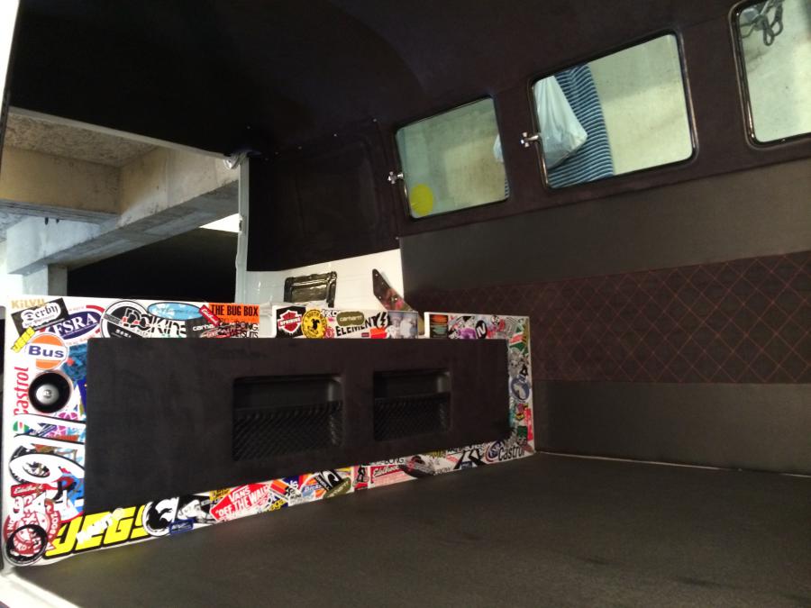 La banquette est fini! Enfin presque car il faut reprendre la conception pour un meilleur rendu mais on verra ça après la saison! L'ensemble est assez sombre et sobre c'est sympa mais je souhaitais "accentuer" le coté "ludique" du bus qui servira en fait pas mal aux sorties sportives du week-end donc un petit coup de "sticker bomb" sur la ventilation et la plaque de fermeture en carbon est finalement peinte entièrement à l'exemption de la forme du logo DDK... J'ai récupéré les panneaux intérieurs et presque tout monté! Ça fait plaizzzzz! J'ai finalisé le "cadre" du clic claque, j'y ai intégré les deux vides poche de newbeetle (que j'avais achté au départ pour la mex...) et caché les hp arrières derrière un cadre en alcantara perforé!