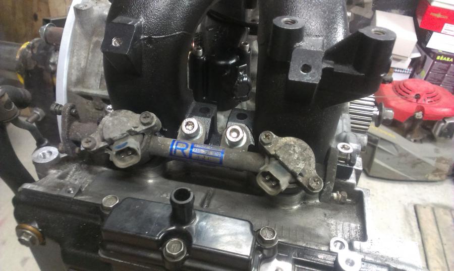 - encore une mauvaise surprise : le thermostat a du casser dans le passé, car il est vide... le neuf est en commande. Dans une pompe neuve, je met un thermostat neuf... - les rails d'essence alu ne convenaient pas à mes injecteurs... j'ai tenté un usinage, que j'ai foiré! Je pars donc sur les rails d'origine avec quand même les connecteurs AN6. Je verrais l'évolution dans le futur, mais tout sera prêt. Les bonnes :