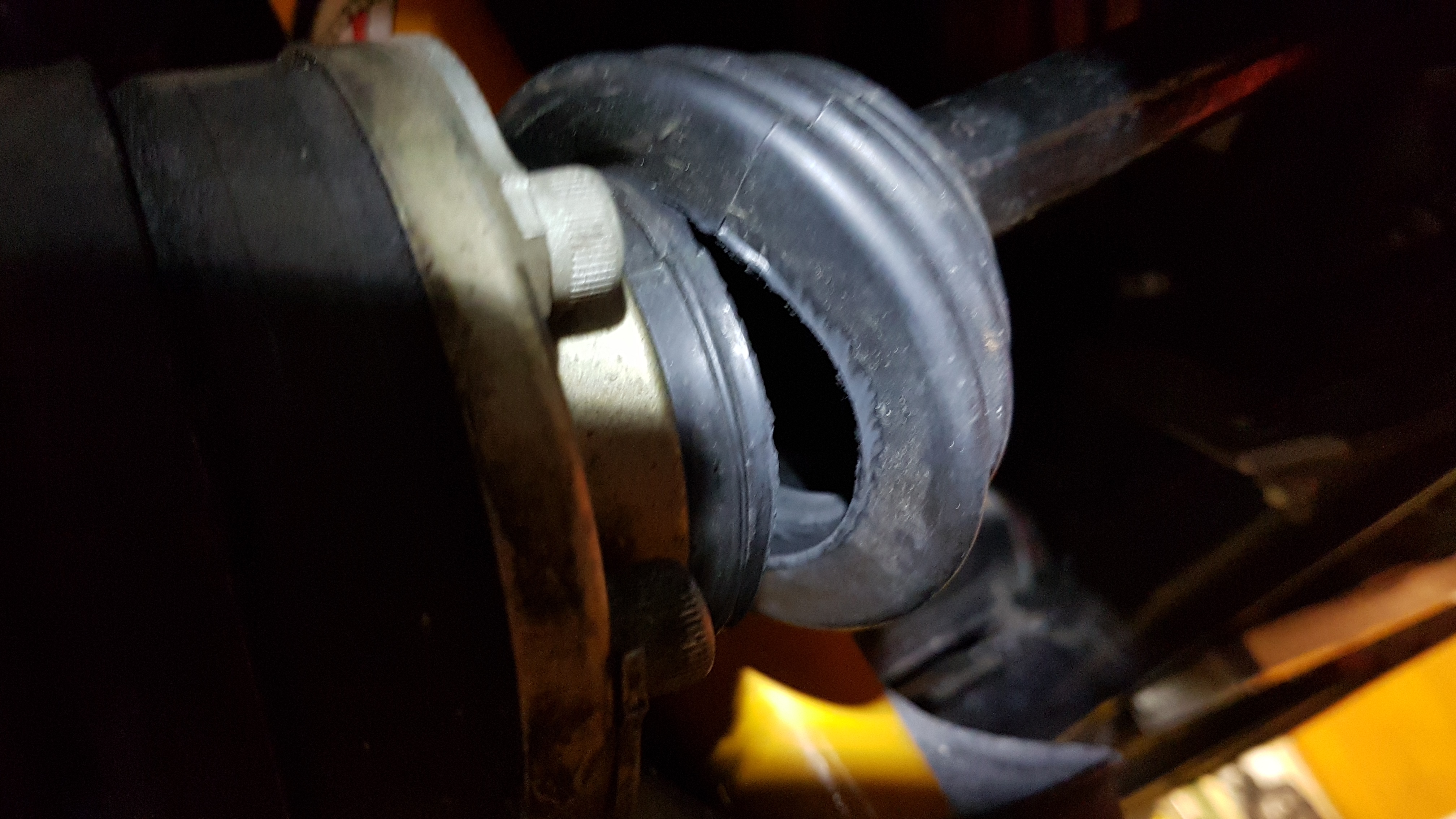 Celui de gauche étant un peu récalcitrant à sortir de son emplacement au niveau de la corne de châssis, je me suis mis sur le dos pour avoir un bon appui ... et inévitablement j'avais un visuel imprenable sur le soufflet de cardan
