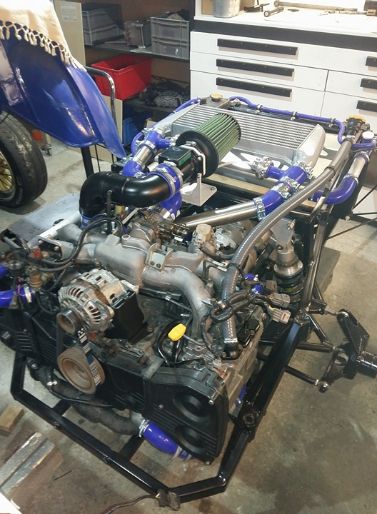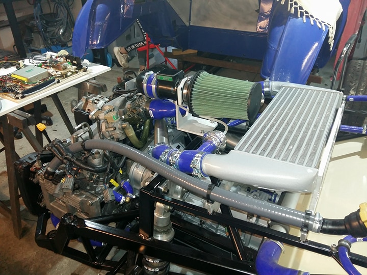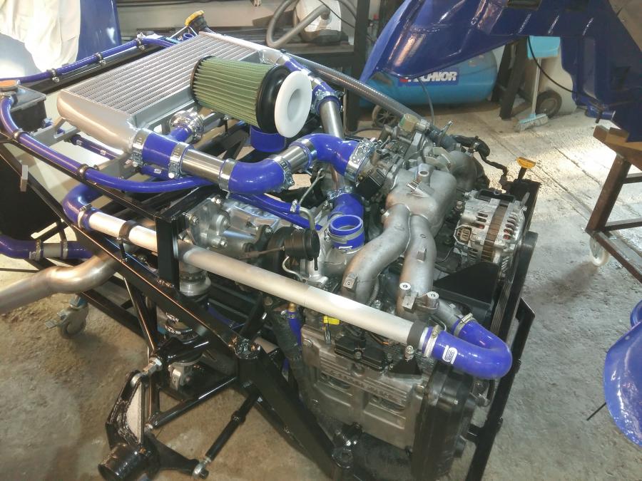ligne échappement inox en 63 collecteur isoler a la bande thermique embrayage monter complet en neuf avec récepteur hydraulique turbo td05 en place , circuit d huile et d eau ok position future du gros filtre a air conique , le conduit d admission et presque terminer , je reçois le débitmètre dans la semaine