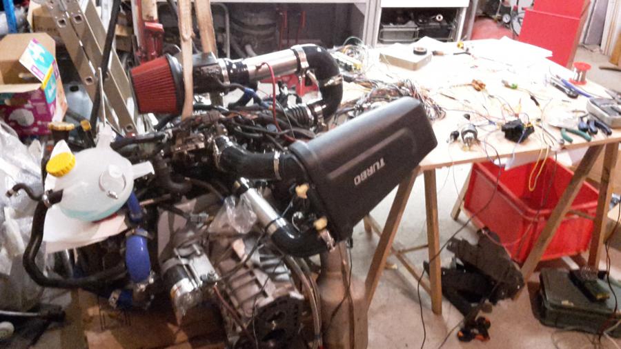 - Sur celui d'origine, tu as 2 durites, une qui vient du turbo, l'autre qui pars sur le tube rigide qui court le long de la pipe d'eau. A l'autre bout, c'est la pompe à eau. Pour l'instant, une durite relie les deux sur mon montage test. Ce sera différent avec le montage définitif, et le chauffage.