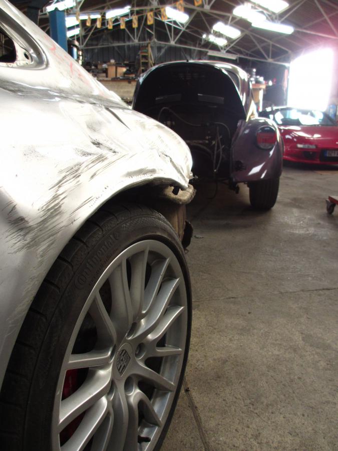 Le capot pour fermer l'avant que j'ai bizoté pour éviter d'avoir à reculer la boite ou a taper dans la coque... Une fois en place avec le support de boite la découpe pour le démarreur et le trou rebouché La totale!!! Toujours en charmante compagnie.... une complète pour la 997... Et en fin de journée... in da place!