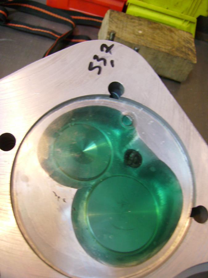 Le bloc étant à l'usinage pour reprendre le diamètre des emboitements des cylindres car il n'y avait pas assez de jeu j'ai controlé les culasses. Et la petite déception car le préparateur m'avait fait les chambres à 53cc, hors elles allaient de 51,7 à 52,9cc et pour avoir le rapport volumétrique que je voulais j'ai agrandi les chambres à 54,5cc ce qui fera 11:1 de RV.