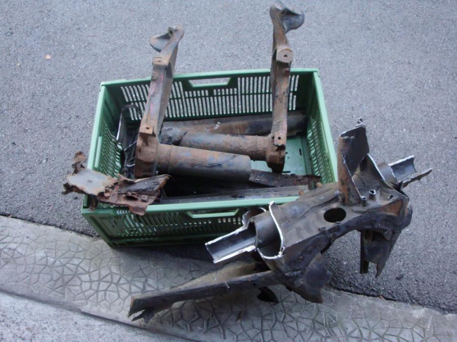 Donc j'en ai chier un moment pour récupérer ces supports sur le cul donneur. Ils sont également soudés à l'intérieur des cornes et ça c'est galère. Puis une fois tout couper ça fait des petits bouts, ça prend moins de place. Ensuite avec les gabarits "façon jacquo", ça va nickel. Et voilà, ça c'est fait. En tout 8h de taf un dimanche au soleil.