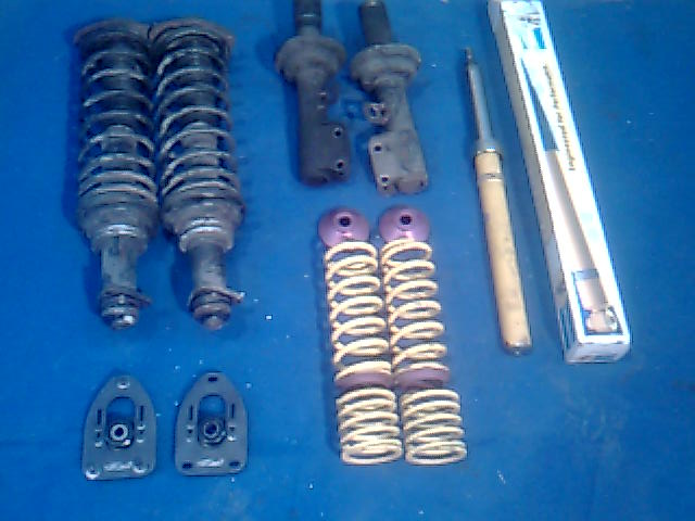 Les jambes 74 origine, la paire de bilstein, la paire de ressort KW (pour passer en standard), les platines réglables ET mes anciennes jambes de forces de la cup à trois points et réglable.