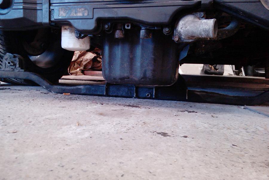 Mais pourquoi faire? Pour pouvoir bricoler le moteur sur un truc stable, le vidanger tranquille, et surtout le basculer de 90°. Pourquoi? la photo parle d'elle même : 7cm du sol...