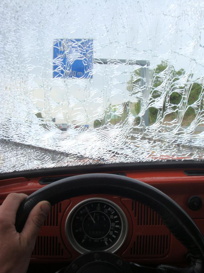 Arrivé à 40km de chez Marc, nouveau problème et grosse frayeur au passage pour moi dans la 1302. En plein milieu de la circulation, en roulant à 110/120 tranquillement, le pare-brise à décider de pas finir le voyage. Sans raison particulière, pas de bosse, pas de caillou, d'un coup, il à éclaté m'obligeant à me précipiter sur la bande d'arrêt d'urgence.