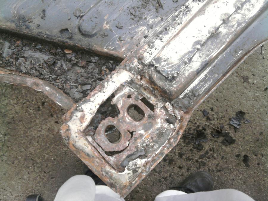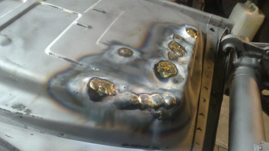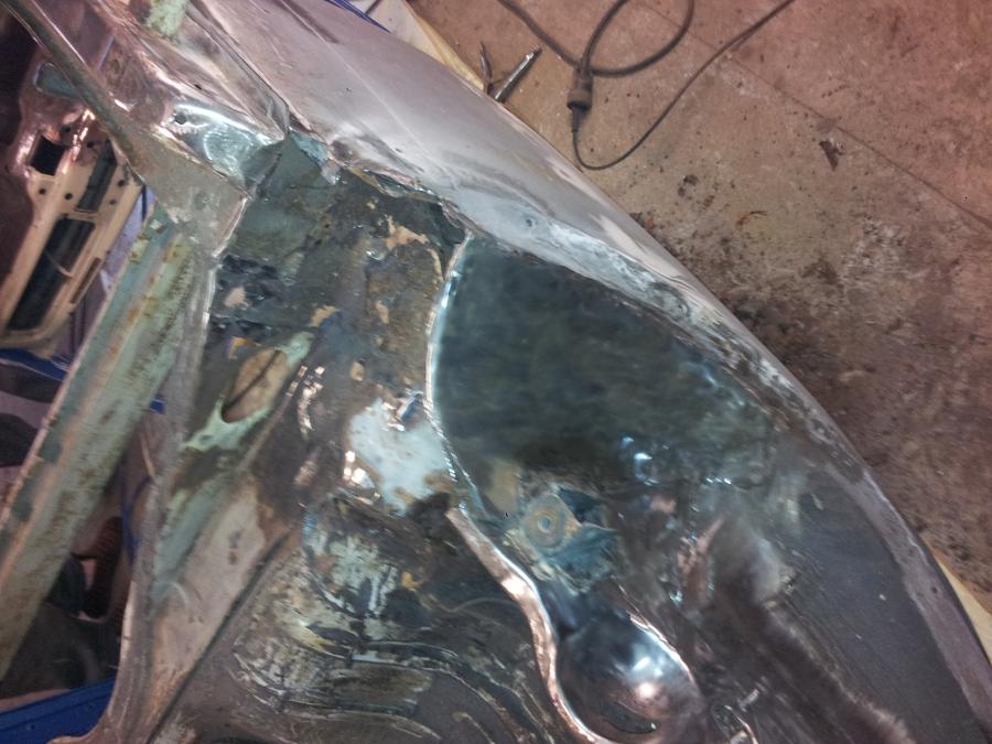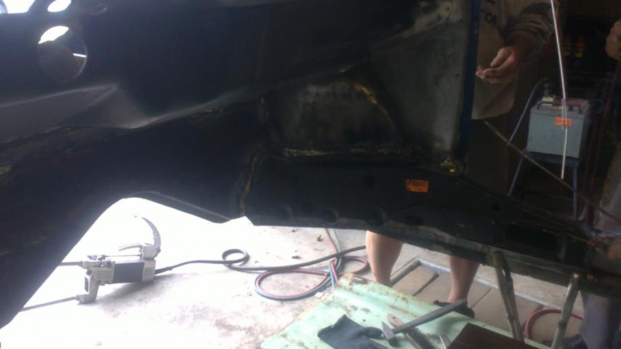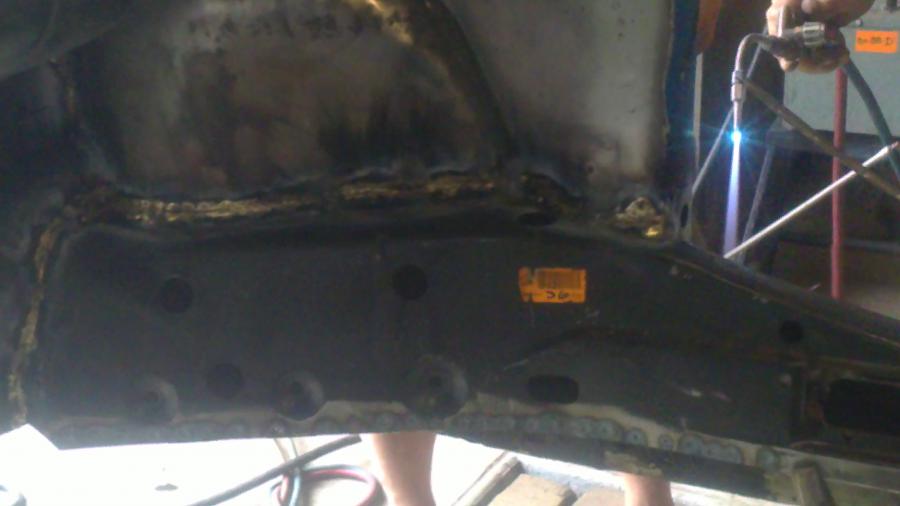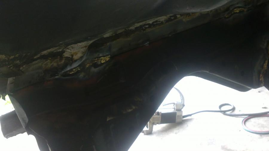 "soudure entre châssis et coque" sur le chassis de nombreux trous sont présents et un demi-plancher et très fragilisés ainsi que les trous de passage de vis du chapeau de gendarme sur la coque de nombreux rajouts de tôles à l'automatique 3 parfois 4 épaisseurs un longeron a changer les deux renforts avant la contre aile droite celle de gauche a combler les soudures la tôle de fond avant le tableau de bord a remplacer car il a été découpé.. les traverses arrières et des partis de fond de coffre à ressouder y a du taff