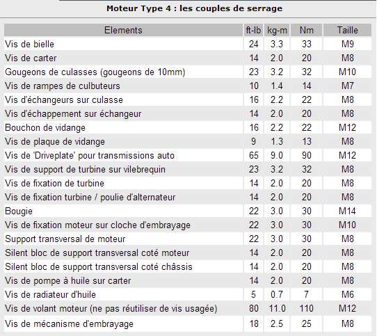 Tant qu'on y est balancez les couples pour les boulons de bloc (les 6 gros et les petits) et pour tous les accessoires comme ça, cela fait un sujet qui peut être mis en post-it et qui pourras intéresser les novices comme moi ;)