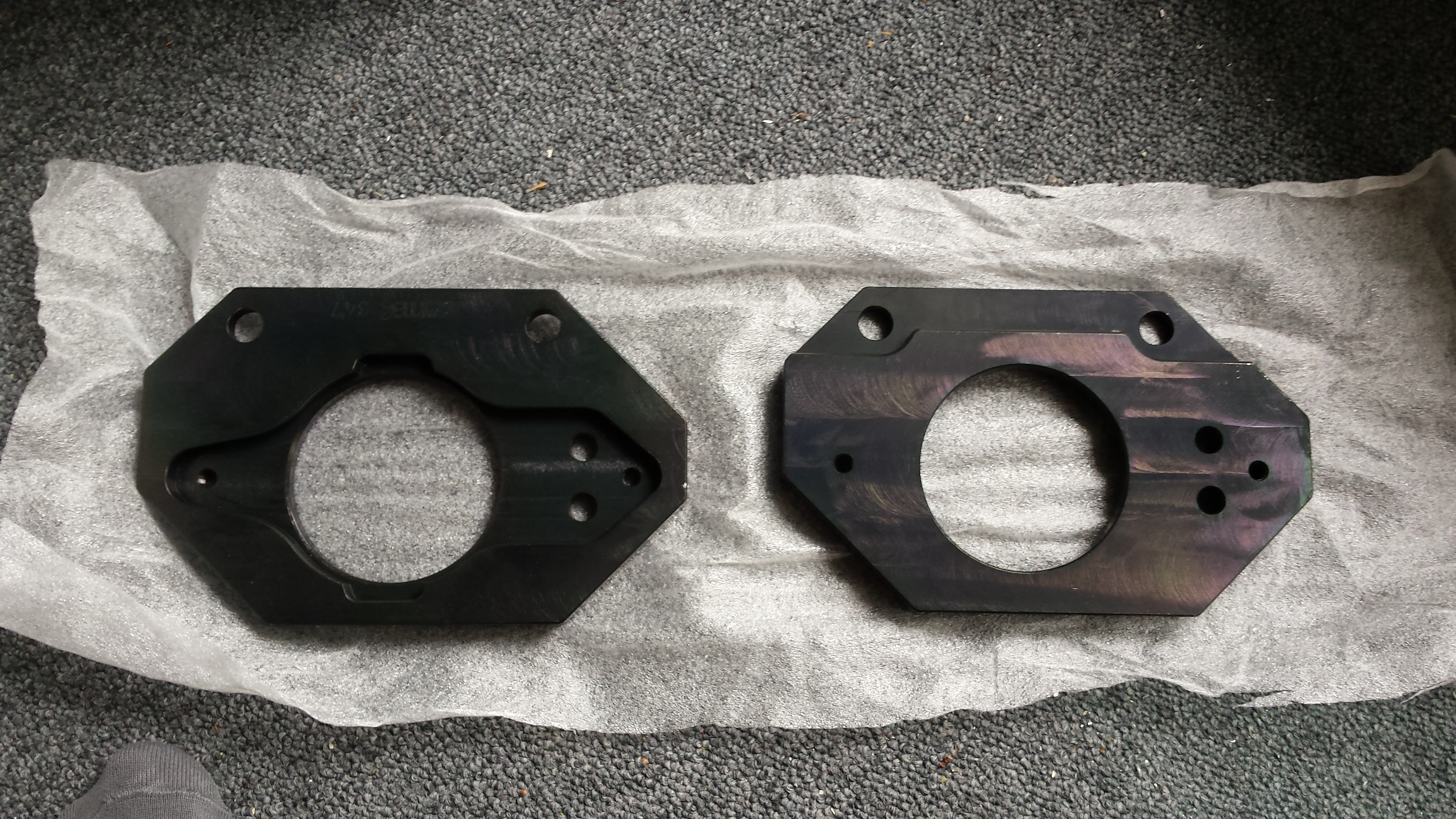 Ensuite j'ai reçu les platines d'adaptations et les moyeux (que j'ai commandé après m'être aperçu que les moyeux d'origines sont d'un diamètre trop important pour les disques de T4).