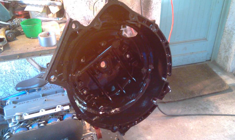 Les deux demi-cloche ont été assemblées grâce à une pièce de liaison qui se reprend sur les points de fixation d'origine VW ainsi que les points des supports de boite supérieur et côté bm, sur les quatre point de fixation du moteur + quatre point annexe de fixation carter. Le tout monté avec cale de centrage et aligné au dixième. De ce côté, je sais que je n'aurai aucun soucis. Coup de bol côté queue de boite, le bout fait exactement le même diamètre que chez bm et rentre en lieu et place.