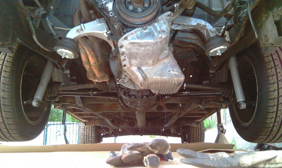 Bon, pour l'échappement, à oublier, il est trop bas et sera repris, je vais repartir sur un collecteur complet 4/1 maison car l'origine me le fait descendre beaucoup trop bas. Pour le radiateur de droite, je compte le faire en amovible pour passer au moins les câbles de batterie en cas de coup dure. La barre de support moteur est a été doublée blindée pour une bonne raison (une simple barre aurait suffit), elle fera partie de la future structure de l'attelage, je voulais quelque chose de lourd pour n'avoir aucun problème. j'avais prévu des plaques pour me faire un blindage de carter vu la fragilité mais pas besoin, ça descend assez bas.