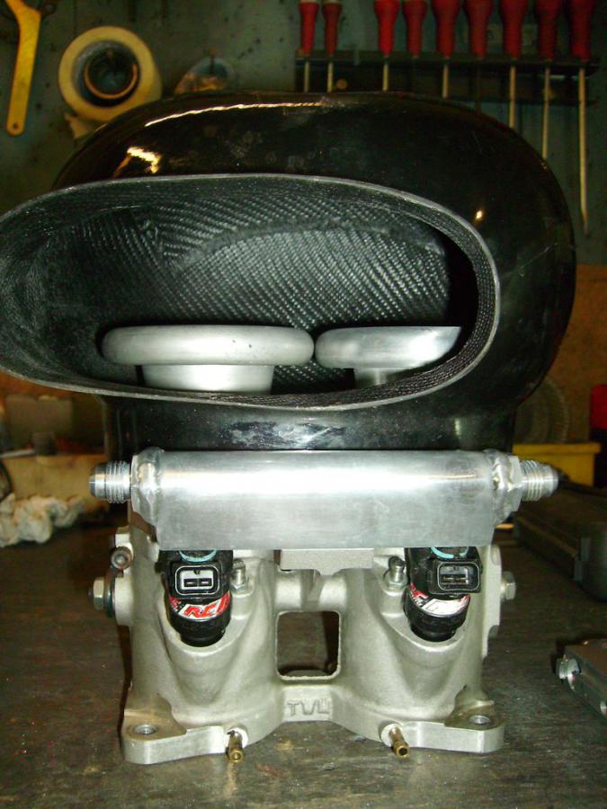 Et avec la cloche du filtre central. Je vais devoir changer les pipes d'admission par des BAS pour avoir les injecteurs à l'intérieur et non à l'extérieur car les rampes de carburant ne passent pas à droite du compartiment moteur.