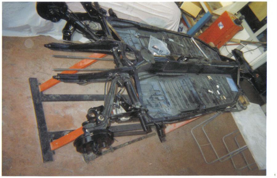 Et là, le décoquage complet, puis carrosserie pure (le pavillon avait eu le droit à des portes papillons, mal ressoudées)(garage).jpg[/attachment] Mise en apprêt: Chassis pret à recevoir bientôt la coque: Vues sur le moteur et la boite de vitesses: Et enfin quelques photos de l'ensemble: Actuellement elle est dans la phase 1 de sa transformation:
