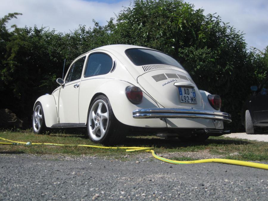 bon apres de nombreux essais j'y suis arrivé mais ca ne fonctionne qu'avec mon portable (dsl pour la qualité...) il s'agit donc d'une 1303 de 74 originaire du texas. elle sort de resto (decoquage, sablage, changement planchers, longerons...) l'exterieur est maintenant beige mini avec des porsches cup en 18". au niveau du chassis c'est du classique grosse barre stab av, barre stab ar, 4 disques, ceinture de boite, combinés filetés, amorto bilstein ar, silenblocs urethane... l'interieur est refait grace a du TMI sauf le tableau de bord fait maison et recouvert de cuir et carbone et garnis de quelques manos VDO. au niveau de la mecanique c'est pour l'instant un "petit" 1641 un peut preparé accouplé a une boite rancho qui propulse (gentiment...) l'ensemble! voila voila!!