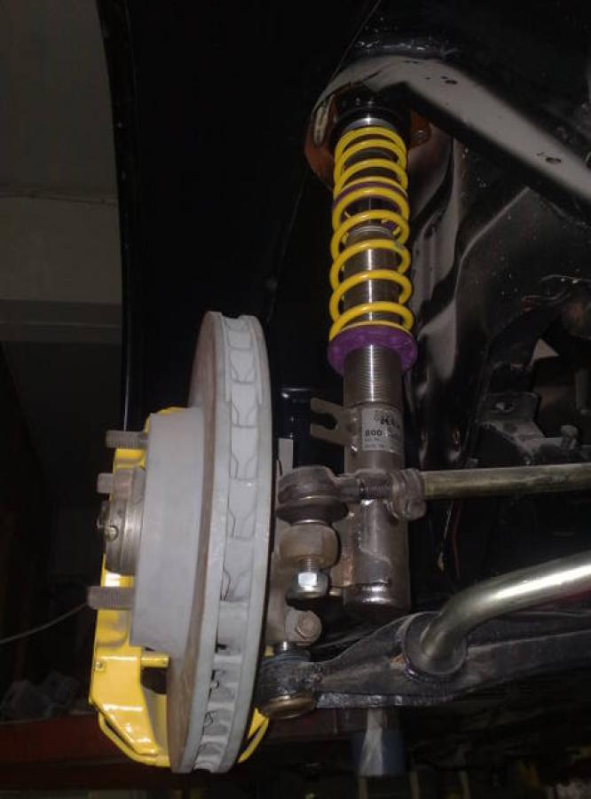 Have you lowered the front axle ? I wonder if you face bump steer issue with your front setup ( Kw coilover / 1303 suspension arm / anti-roll bar / 1303 disc spindle ?)