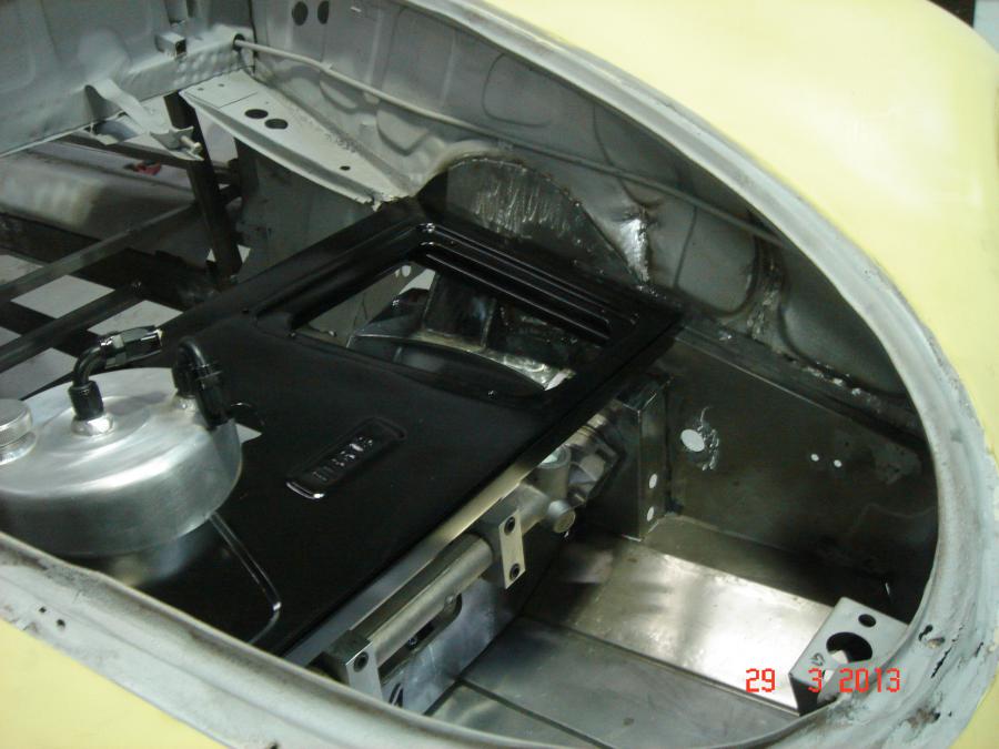 En attendant les pièces pas dispo chez wilwood je suis à fond sur la tôlerie. Déjà j’ai fini l’arceau ce qui m’a permis de remettre la coque sur le chassie définitivement , et je lui aie fais un chariot pour pouvoir liberer le pont quelques soudures sur le bloc avant pour bien solidariser tout ca et je commence par l’arrière le changement des tôles pourries ou inadapté , Bref je dégage toutes les tôles de 1959 pour en refaire d’autres plus adapté au 6 et a son encombrement.