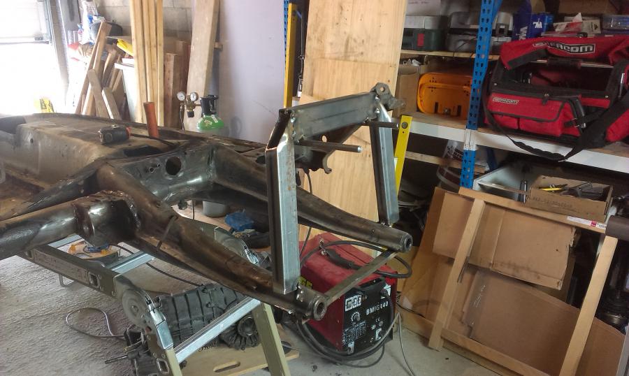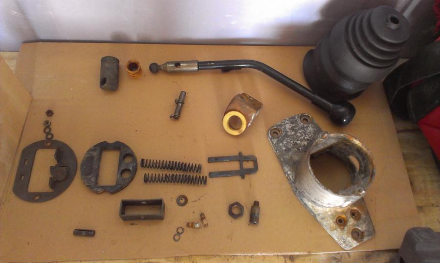 Tout à commencé en juillet dernier, j'ai reçu mon levier 915. Moche, mais avec la boule en bon état! J'ai juste refait rapidement la base, qui était rongée, ce sera suffisant pour les essais de montage. Fin décembre, on me prête une boite de 1302. Je la monte pour prendre des cotes et faire un gabarit. Je me rend compte au passage que le crétin qui a soudé les supports de bras l'a fait sans monter de support de boite au bout des cornes, donc ça a travaillé. faudra re-chauffer pour rétreindre... ya 1mm de décalage! De toute façon, les soudures sont dégueues, je vais les reprendre plus tard.